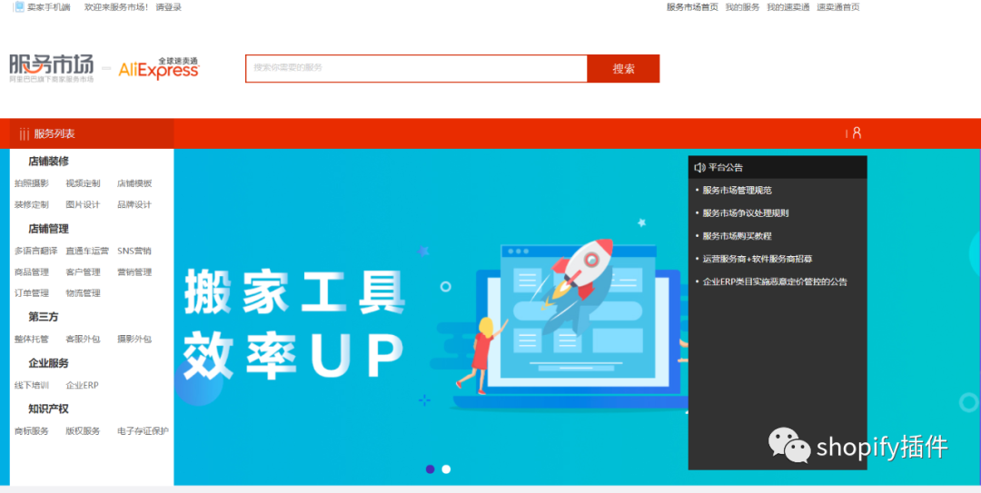 可以看出应用在shopify和卖家心中的地位,实际上这基本上是做电商平台的标配,因为平台方不一定有精力做所有的功能,因为不同的商家的需求是不一样的,这就要求一种更灵活的组织方式,像阿里旗下速卖通服务市场,国内的淘宝,京东,包括一些开放平台如钉钉,都会有类似的市场,如下图: