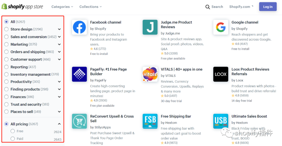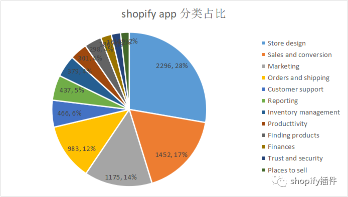 Shopify app store截止到现在为止共有5267款插件,总共有12大类73小类,相当全面,涉及到卖家日常工作中的方方面面了,其中数量最多的种类是store design(店铺装修),看来脸面还是比较重要啊!