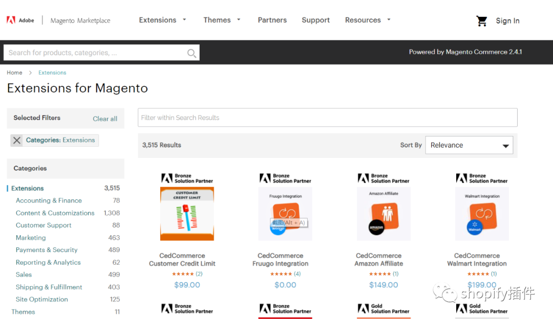 Magento总共有3515款插件,其中三分之一是需要付费的,且其收费相对还是比较贵的,这一点在后面对比shopify就可以看出来。