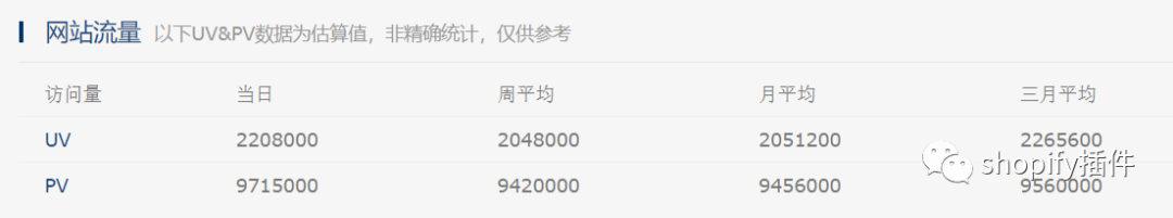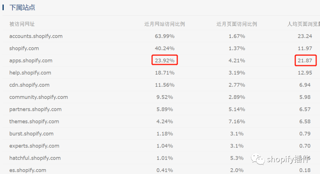 如下是shopify各个子域名的流量访问情况,shopify整体每天220万的独立访客,app store是排在第三位的,仅次于主站首页以及帮助页的访问,占比达到23.9%,每天的访问大概在80万量级,而且访问的页面数接近于第一,说明很活跃且粘性强,这个访问量还是很不错的。