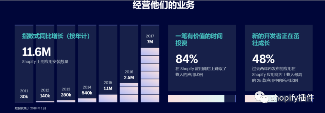 我们再看一下app的安装情况,目前全球有超过100万的商家使用shopify建站,从2011年到2017年累计app安装量超过1100万,也就意味着平均每个商家安装超过10个app(这跟直观的印象是差不多的,因为shopify插件并不是越多越好,太多了会拖慢网站打开的速度,所以卖家一般也不会装太多)