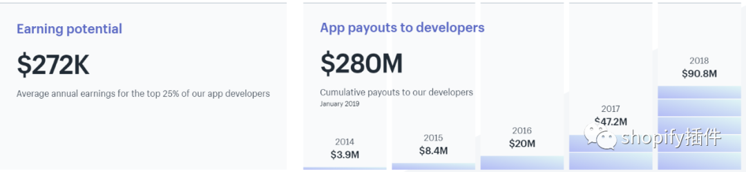 我们来看看app的收益情况,目前app store总共有5000+个app,我们从shopify官网上可以看到从2014年到2018年shopify累计付给开发者的收益在280万美金,现在2020年肯定远超这个值,这就意味着平均每个app开发商至少获得约5万美金的收益,头部的25%开发者获得27万美金的收益,是平均数的五倍不止,这个可观的收入驱动着开发者不断为卖家提供更好的功能,也帮助shopify吸引更多的卖家从而形成良性循环,由此说明背后的开发者是功不可没的。