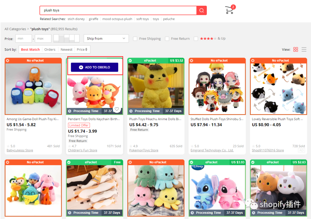 有一些插件也有配套的谷歌插件,安装后使用起来更方便一些,典型的比如oberlo,装上之后在速卖通搜索商品,商品旁边会出现oberlo的小图标,可以一键采集到的自己的店铺中非常快捷,如下图: