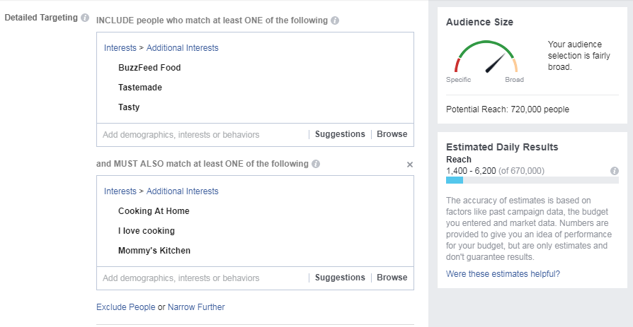 定位在18-65岁,美国,兴趣范围“BuzzFeed Food,Tastemade,Tasty,Cooking At Home,I love cooking,Mommy's Kitchen”