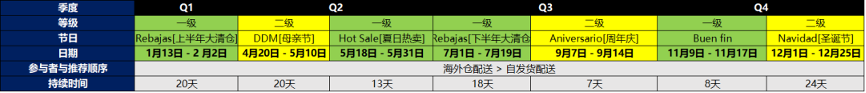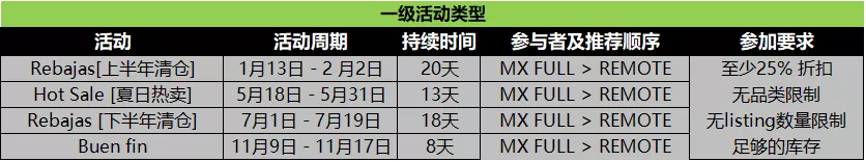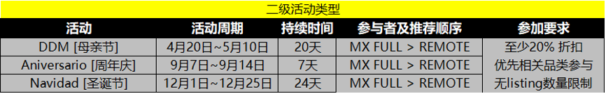 墨西哥一二级活动,Mercado Libre美客多按照等级将墨西哥全年活动划分为3 个等级。