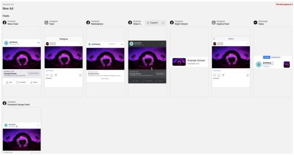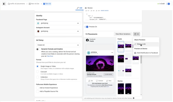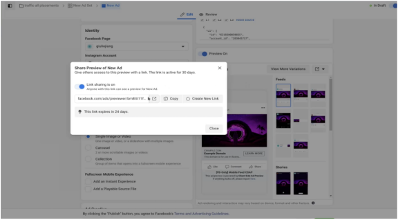 借由Ads Manager中新的预览共享功能,广告主可以在发布之前更好地协作处理广告素材。广告主现在可以生成⼀个链接,与拥有FB帐户的任何人共享其广告草稿(发布之前),并且可以将广告草稿注入其FB Feed和IG Feed中,来获得更准确的预览。