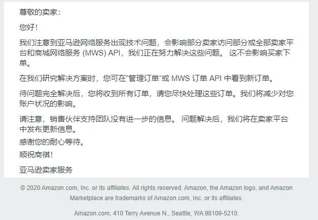 亚马逊随后也发来邮件表示是亚马逊网络服务出现了技术问题,后台目前出现的BUG影响的仅仅是数据问题,并不会影响买家下单。所以还请大家耐心等待。