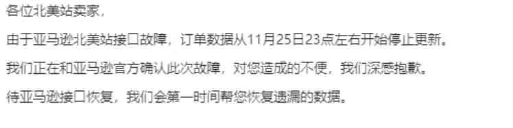 由于亚马逊北美站接故障,订单数据从11月25日23点左右开始停止更新。