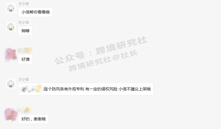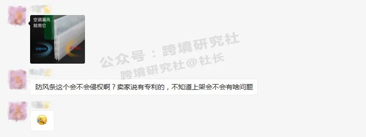 社群中,有位卖家咨询了一个让人都想不到的产品:防风条,看起来并不引人注目,但是该卖家说,同行称产品有专利,不确定是否真的这样,上架会不会有风险。