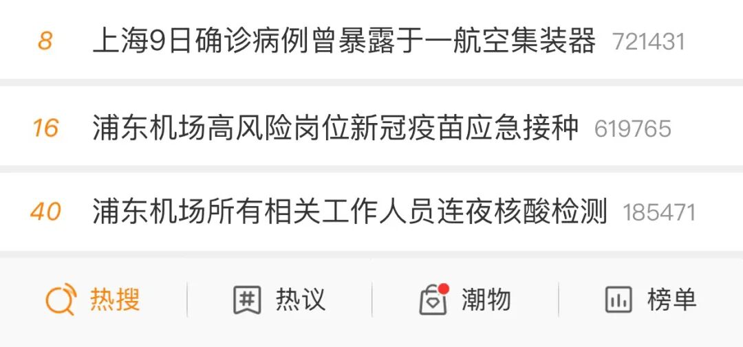 今天,微博话题上依然挂着几个关于浦东机场因工作人员确诊新冠病例的热搜。