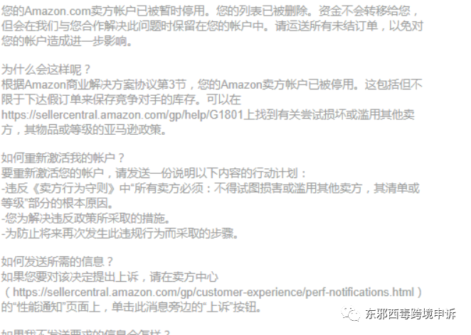 如上图所示,便是赶跟卖不小心被亚马逊封号的通知邮件,按照邮件中的提示,我们可以知道账号被封的原因是 “下达假订单来保存竞争对手的库存”, 正如邮件中所讲,事实上很多卖家赶跟卖的方式就是这样,下虚假订单卖空竞争对手库存,等于“自动下架”了跟卖者的库存,让跟卖者知难而退。事实上这种赶跟卖的方式是有风险的,而且还很大,被抓到十有八九是要被封号的,如果有朋友遇到这种问题,在向你表示同情后,我可以明确的告诉你,赶跟卖被封号,是可以申诉回来的,不仅可以申诉,而且成功率很高!