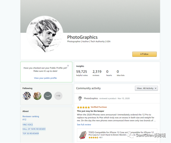 1. 首先我们要审核他的Amazon profile ID,如下图。他的profile id 这里可以看出最近买的产品,和上的评论。看他是不是购买频繁的账号,看他有没有给别人上差评。一般购买频繁,给别人上过差评的要否定掉。还要看看他最近是不是买了同类的,买了同类的很多还没你的说明他也有可能不是真的reviewers。