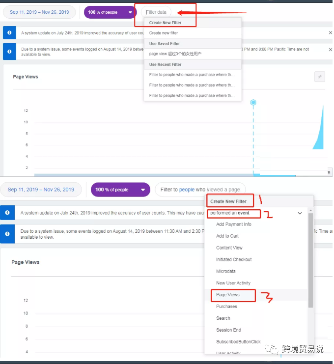 到页面最上面,filter,也就是过滤条件。选择 create a new fliter–》 performed a event–》page view–> event count–> is at least-3