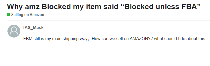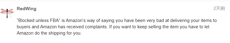 关于这一点有卖家也提到了,该卖家写道:“Blocked unless FBA是亚马逊的一种说法,表示卖家在向买家交付商品方面表现很差,亚马逊也收到了投诉。如果卖家想继续在亚马逊上销售商品,则必须使用亚马逊FBA。”