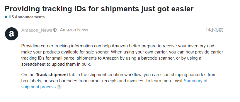 亚马逊入库已成龟速,卖家们几近崩溃!最直接的原因就是美国疫情导致的人手不足,外加,亚马逊某些类目销量暴涨,卖家们疯狂补货,导致某些地区仓库的货物量暴涨。 近日,亚马逊为更好的帮助卖家产品入库,发布了一则公告。公告原文如下: 卖家提供承运商跟踪信息可以帮助亚马逊更好地接收库存,并使你的产品可以更快地刊登销售。现在,当卖家使用自己的承运商时,可以通过使用条形码扫描仪或使用电子表格批量上传小包裹的承运商跟踪ID。 在货件创建工作流程(shipment creation workflow)中的“跟踪货件( Track shipment)”选项卡上,卖家可以从箱标签中扫描货件条形码,或者从承运商收据和发票中扫描条形码。要了解更多,请访问Summary of shipment process。 公告原文截图如下: 销售旺季即将来临,卖家们需要做好商品入仓准备工作,确保FBA库存充足,毕竟旺季断货对卖家来说损失巨大 。卖家如何做好入仓准备工作呢? 1.检查FBA商品入仓资格,了解商品是否符合FBA商品限制政策; 2. 匹配并完善商品信息,确保商品编码、分类、尺寸等信息准确无误; 3. 做好商品预处理工作,包括商品包装、装箱、正确为商品贴标等; 4. 提供箱内商品信息,以便亚马逊提前做好收货规划。