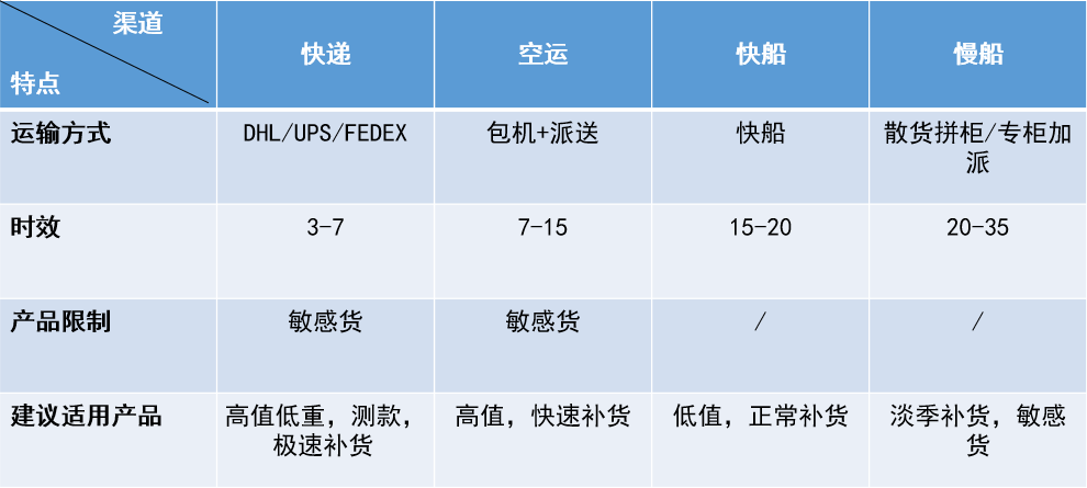 目前主流的海外仓头程运输方式有快递、空运、快船、慢船等形式,时效从几天到超过一个月不等,价格也相差较大。针对不同的头程运输形式,各位商户可以根据产品的需求及运输的目的进行选择。
