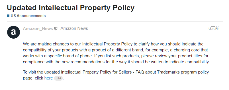 亚马逊表示,目前正在修订更新平台的知识产权政策,以指导卖家应如何描述自家产品与其他品牌产品的兼容性。比如售卖与特定品牌手机兼容的充电线时,需检查充电线标题描述是否符合新的政策建议,以表明兼容性。