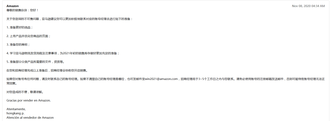 客服的回复并没有直接说明商品链接变为不可售的原因,只是让卖家联系招商经理,且邮件中的内容都是让卖家为2021年的销售做准备,难道这些账号只能等到明年才有销售权吗?