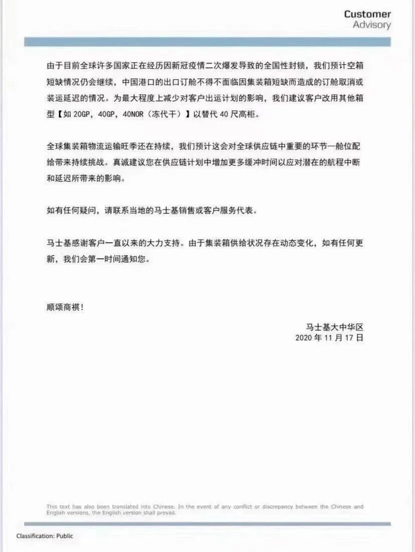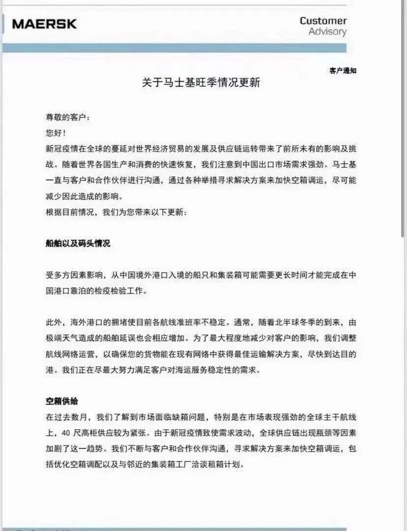 马士基17日也发声了,表示针对此现象,要恢复往日正常的运输状态还需要很长的一段时间。随着消费旺季的到来,目前来看,在接下来一段时间内,航运价格维持高位水平仍是大概率事件。目前的国际物流市场,一切皆有肯能,如果这两天订舱觉得贵了,不要着急,再过一段时间,你就会发现…