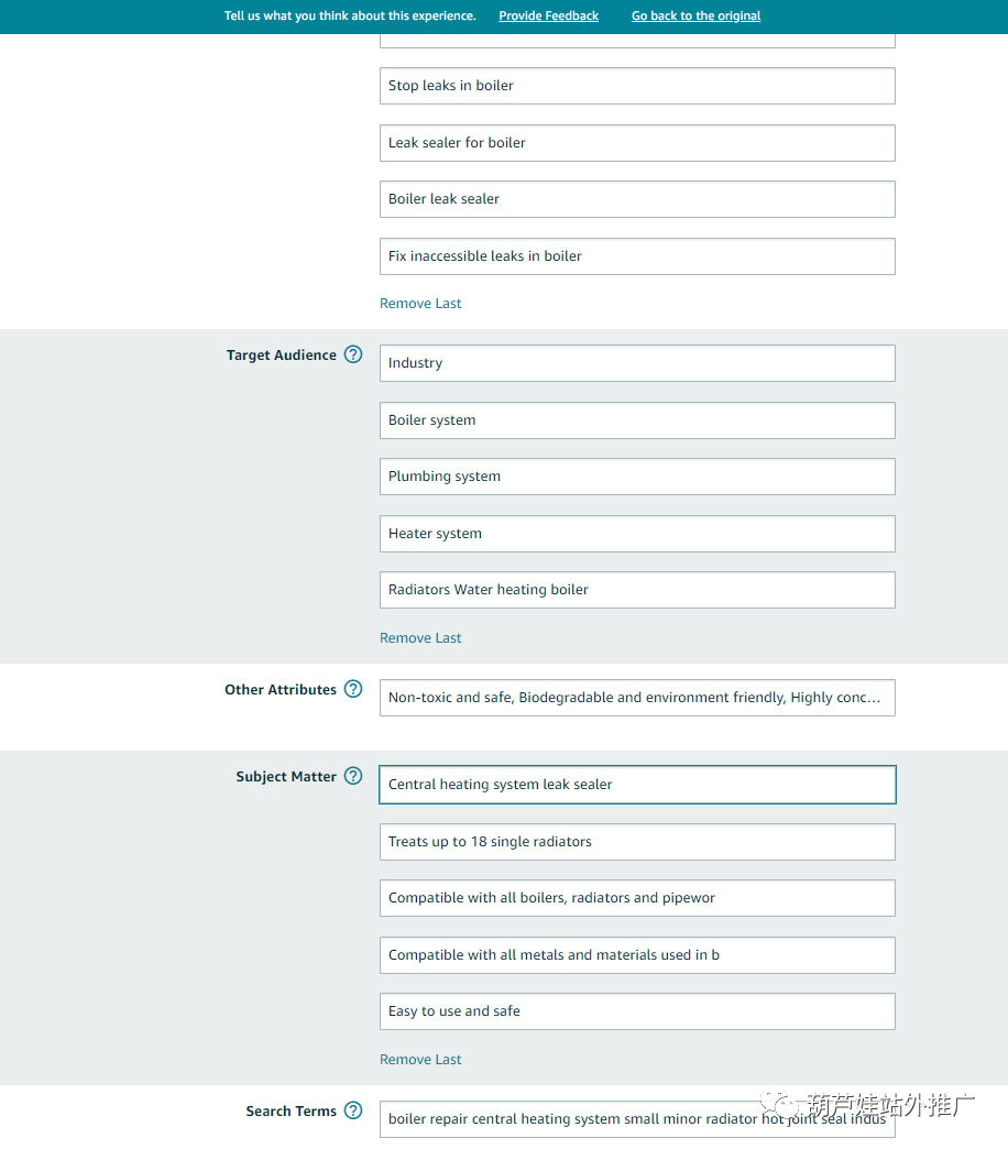 另一个永远不要低估的关键词来源是竞争对手的产品。找到你的前5个竞争对手或搜索结果页面首页的前5个产品,彻底分析他们的listing,最重要的是他们的标题,他们在要点和描述中使用了哪些关键词?观察他们标题的构成,并尽量使你的标题与之相似,你的标题里必须有他们标题里提到的词。另一种获得优势的方法是进行反向ASIN搜索。靠猜测在这里是行不通的,你需要做出可靠的数据驱动的决定,这就是关键词研究工具发生作用的地方。只需输入种子关键词,就可以得到大量相关关键词的列表,以及它们的搜索量、季节趋势等等。这种数据洞察将帮助你做出正确的决定。PPC广告是数据挖掘关键词的好地方。自动广告是一个相对简单和可靠的方法,可用于查找新的搜索字词并确定关键词的相关性。在运行自动广告系列一周或更长时间后,下载搜索字词报告,并确定购物者使用的关键词,你可以看到关键词获得的展示次数与点击次数和销售次数之间的关系。归根结底,最重要的是根据转换率对关键词进行优先级排序。产品标题是放置种子关键词和其他主要关键词的主要位置,然后是要点和描述。与一般概念不同的是,在要点和描述中添加的关键词不会被编入有机排序索引,它们用于赞助广告。最后,在后端填充字段,这将在下一点中详细解释。你不能在listing中包含所有的关键词,但是你仍然可以为这些关键词排名。这时,后端关键词可以帮助你。你可以在后端搜索条件中添加多达249个字符,买家无法看到这些关键词,但亚马逊可以。如果你想知道后端关键词是否被索引,复制整个字符串并粘贴到搜索栏中。如果出现任何相关产品,则对关键词进行索引。仅仅添加后端关键词是不够的,你还应该填写Subject Matter、Other Attributes、Target Audience和Intended Use字段。他们将进一步帮助亚马逊把你的listing带到正确的受众面前。大多数卖家忽略了这些领域,这是大错特错的。有什么大的节日或促销活动要来了吗?在你的文案中使用相关关键词,并在广告中添加一些关键词。尽管你的listing和后端字段已经塞满了关键词,但试着做一些空间调整来添加一些节日或礼物关键词,特别是如果你的产品在节假日需求更高的时候。试着在关键词工具中搜索“Christmas Gift”或“Prime Day Deals”,你会惊讶于其搜索量。这些关键词由拥有Platinum账户的卖家添加。拥有Platinum销售门槛的卖家可获得资格。通过使用Platinum关键词,卖家可以定制产品的结构,以便购物者在访问店面时能够查看。除非你是Platinum卖家,否则填写Platinum Keywords字段毫无意义。- 问题2、我是否应该使用错误拼写、品牌名或ASIN作为关键词?
