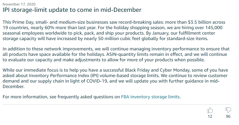 11月17日,亚马逊发布公告表示,在本次 Prime 会员日活动期间,中小型企业的销售额破了纪录:在 19 个国家的销售额超过 35 亿美元,与去年同比增长近 60%。在假日购物季期间,亚马逊将在全球雇用超过 145,000名季节性员工来从事商品的分拣、包装和配送工作。截至 1 月份,全球亚马逊运营中心的标准尺寸商品仓储容量将增加近 5000 万立方英尺。 除了这些网络改进外,亚马逊还将继续管理库存绩效,确保假日期间有充足的仓储空间。ASIN 数量限制仍然有效,平台将持续评估仓储容量并做相应调整,尽可能为卖家的商品留出更多空间。 此次公告放出的大消息是,亚马逊将重新评估在美国疫情最新情况下的配送链运力以及买家消费需求,然后会在12月中旬针对IPI仓储限制发布新的指导政策。 这一公告也证明了不少卖家的猜测,就是美国的隔离政策失败被迫重启经济之后,亚马逊仓库的防疫压力会是一个长期存在的问题。防疫压力会严重限制仓库处理订单的效率和上限,因此想要解决订单暴涨带来的配送压力只能扩大整体仓库和处理人员的数量。 亚马逊在公告中提到今年为了应对疫情,在年末的假日购物季期间亚马逊将会雇佣145000名季节性员工,并在明年1月份之前,将标准尺寸的FBA仓库容量扩大5000万立方英尺。这些工作能有效改善年末旺季时的配送情况,卖家会因此可以使用更多的仓储空间。 所以虽然亚马逊没说12月中的IPI大消息是要怎么改,但是从公告透露的这个信息来看的话,大概率是会将卖家的可用空间进行一些上调。