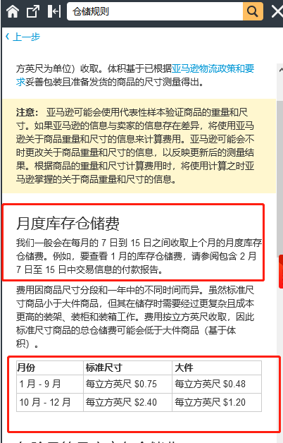 根据亚马逊仓储规则,仓储费用因商品尺寸分年段和一年中的不同时间而异。可以看到,1月-9月,收费标准为“标准尺寸每立方英尺0.75美金,大件每立方英尺0.48美金;10月-12月,收费标准为每立方英尺2.4美金,大件每立方英尺1.2美金。
