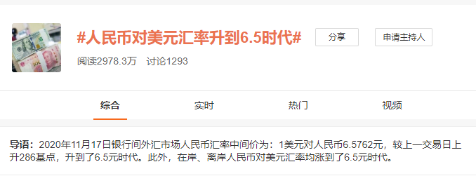 卖方通获悉,中国人民银行授权中国外汇交易中心公布,2020年11月17日银行间外汇市场人民币汇率中间价为:1美元对人民币6.5762元,较上一交易日上升286基点,升到了6.5元时代。此外,在岸、离岸人民币对美元汇率均涨到了6.5元时代。