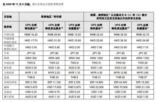 从11月8日起,UPS开始上调旺季附加费,各货代已经开始发布通知,根据UPS官网公告来看,往欧洲地区UPS全球特快服务附加费是16.20元每公斤,UPS全球特快货运服务附加费是28.80元每公斤,UPS全球快捷服务附加费是15.50元每公斤。