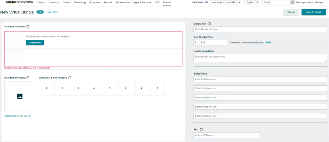 如前所述,只能在亚马逊美国站中创建商品捆绑包,您可以从Seller Central账户创建商品捆绑包,也可以从品牌> 虚拟捆绑包进入。