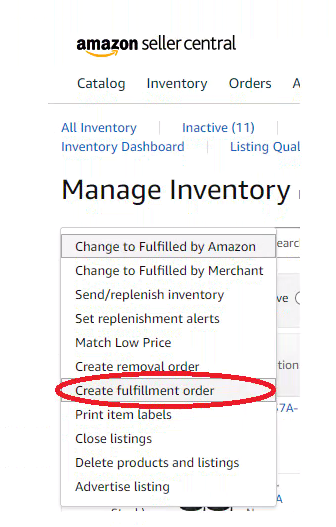 这里的区别是您不需要库存现货。这实质上是一个虚拟listing或外壳listing。相反,您可以使用多渠道配送订单(MCF)。此外,捆绑包中包含的每个SKU都可以使用多渠道配送订单直接从Amazon运送给客户。您可以按照以下步骤创建MCF订单:库存(菜单)>管理库存>选择产品>单击操作下拉菜单>创建履行订单。