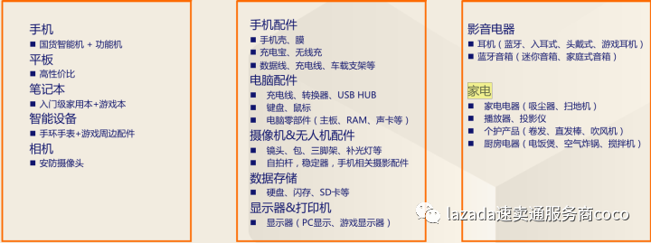 重点品类:手机 平板 笔记本 智能设备 相机 手机配件 电脑配件 摄像机&无人机配件 数据存储 显示器&打印机 影音电器 家电