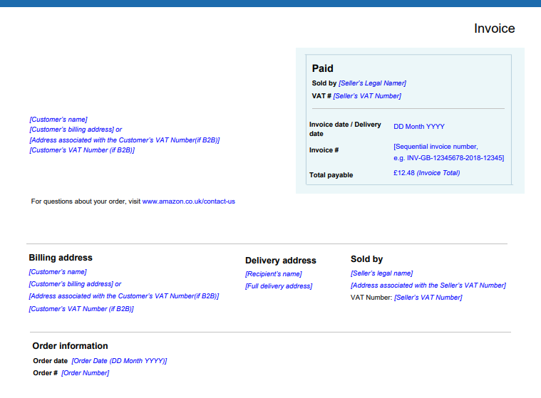 *请注意,如果订单报告上有买家VAT税号时,您需要在发票中添加买家VAT税号。如果订单报告中没有买家VAT税号,请注意这有可能对您的VAT税率计算产生影响。请咨询您的税务顾问。