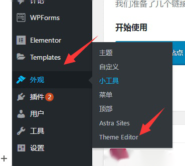 首先登入你wordpress网站后台,找到外观(appearance),点击主题编辑(Theme Editor)。