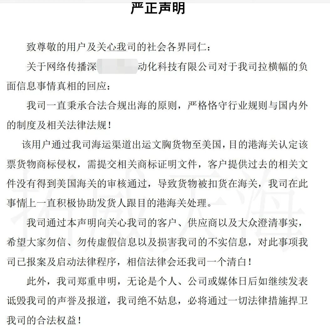在声明中,该公司对此次卖家拉横幅事件作出了解释:该用户通过我司海运渠道出运文胸货物至美国,目的港海关认定该票货物商标侵权,需提交相关商标证明文件,客户提供过去的相关文件没有得到美国海关的审核通过,导致货物被扣货在海关,我司在此事情上一直积极协助发货人跟目的港海关处理。