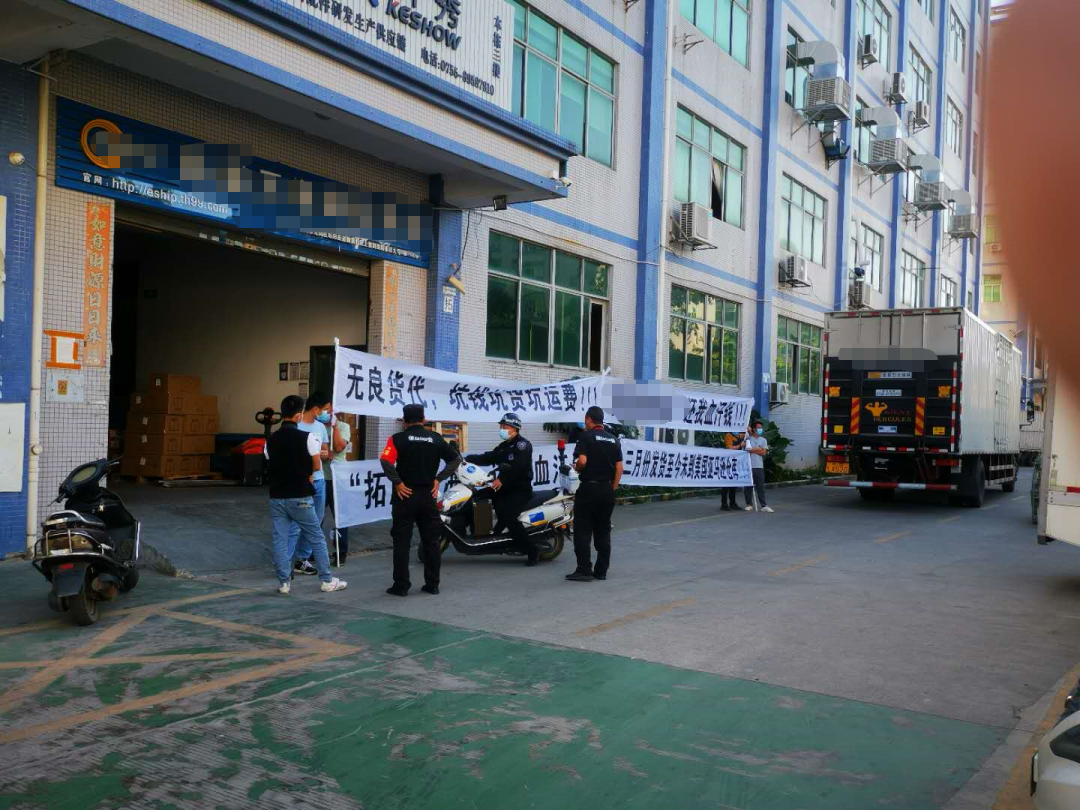 从图中可以看到,在某公司门口,几个卖家正上门声讨该货代公司,并拉了几条显眼的横幅。