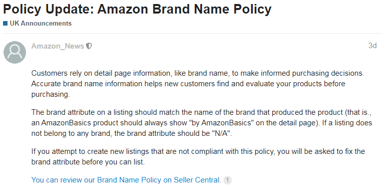 近日,亚马逊发布了品牌政策更新的公告。亚马逊表示,客户依赖详细的页面信息(例如品牌名称)来做出明智的购买决定。准确的品牌名称信息可帮助新客户在购买前找到并评估你的产品。
