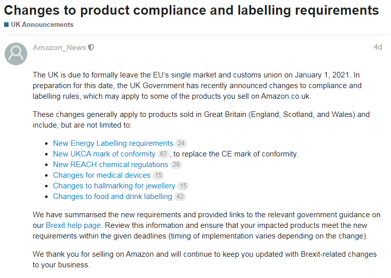 02 产品合规性和标签要求变更 2021年1月1日,英国将正式退出欧盟单一市场和关税联盟。为此,英国政府最近宣布对合规性和标签规则进行更改,这可能适用于你在英国站上销售的某些产。 图源/亚马逊卖家论坛 这些更改通常适用于在英国(英格兰、苏格兰和威尔士)销售的产品,包括但不限于: 新能源标签要求 https://www.gov.uk/government/publications/meeting-climate-change-requirements-if-theres-no-brexit-deal/meeting-climate-change-requirements-if-theres-no-brexit-deal 新的UKCA合格标志,取代CE的合格标志 https://www.gov.uk/guidance/placing-manufactured-goods-on-the-market-in-great-britain-from-1-january-2021?utm_source=POLITICO.EU&utm_campaign=f788347b4d-EMAIL_CAMPAIGN_2020_09_02_01_27&utm_medium=email&utm_term=0_10959edeb5-f788347b4d-189781421 新的REACH化学法规 https://www.gov.uk/guidance/how-to-comply-with-reach-chemical-regulations 医疗设备的变更 https://www.gov.uk/guidance/regulating-medical-devices-from-1-january-2021 珠宝标志的改变 https://www.gov.uk/guidance/hallmarking-requirements-from-1-january-2021 更改食品和饮料标签 https://www.gov.uk/guidance/food-and-drink-labelling-changes-from-1-january-2021 你也可以在亚马逊后台脱欧帮助页面上获取相关指导帮助: https://sellercentral-europe.amazon.com/forums/t/changes-to-product-compliance-and-labelling-requirements/360451?lang=en 检查这些信息,并确保你受影响的产品在给定的期限内满足新的要求(实施时间视更改而定)。 03 亚马逊发布旺季Listing优化提醒 随着假日购物旺季的来临,亚马逊建议卖家一定要保证Listing的完整性,以使买家可以更容易地发现你的产品。 访问“Fix Your Products” 功能页面,帮助你检查Listing的完整性: https://sellercentral.amazon.com/fixyourproducts/suppressed?ref_=SPD_news_Q4_readiness 在“ Listing Enhancements”页面中添加缺少的产品详细信息,可以进一步帮助提高Listing的可发现性。 通过“库存报告”下载“Listing Quality and Suppressed Listing Report(Listing质量和抑制报告)”查找处于“Suppressed(抑制)”和需要优化的Listing信息,你可以使用“Add Products via Upload(上传添加产品)”来上传此文件,从而批量更新这些Listing。 了解有关抑制Listing的更多信息: https://sellercentral.amazon.com/gp/help/G200898440?ref_=SPD_news_Q4_readiness 04 亚马逊卖家App新功能,可发布和编辑产品信息 近日,亚马逊发布公告表示,亚马逊卖家 App推出了一项新功能,卖家可以在移动设备上通过亚马逊App进行发布和编辑产品,每次一个。 图源/亚马逊卖家论坛 具体可操作: 在亚马逊APP内创建和编辑产品变体 搜索你要发布的产品品类,并将常用的分类保存为收藏夹 编辑产品时,可以并排查看详情页面信息与产品数据 05 亚马逊阿联酋站即将开启“双11”大促活动 船长获悉,据外媒消息,亚马逊近日宣布阿联酋站将启动“双11”大促活动,该活动从11月10日午夜开始,一直持续到11月12日。涵盖30多种产品类别,包括电子产品、家庭和厨房、杂货和时尚。 亚马逊表示,Prime会员可以提前12小时享受优惠,以及享受亚马逊美国的免费次日达和免费国际配送服务。与此同时,非Prime会员可以注册免费试用30天,成为首批购买双11促销产品的用户,还可以享受Prime会员的其他优惠。 亚马逊中东和北非地区副总裁Ronaldo Mouchawar(罗纳尔多·穆查瓦)说:“消费者非常期待双11大促期间的购物优惠,我们很高兴能连续第四年再次举办此活动。同时我们很自豪能够提供超过30个品类的本地和国际商品的广泛优惠,并为促销期间的Prime会员提供亚马逊美国订单的独家免费送货服务,从而节省更多。” 06 亚马逊在欧洲启动其首个航空区域枢纽 据外媒报道,亚马逊在欧洲的第一个航空枢纽已正式开始运营,该枢纽位于德国莱比锡/哈勒机场。新工厂占地2万平方米,将容纳两架亚马逊品牌的波音737-800飞机,使其的运营飞机总数达到70多架。 亚马逊表示,新的枢纽将在莱比锡地区在当地创造200多个工作岗位。与此同时,亚马逊还指出,这将有助于其在疫情持续的情况下,继续在欧洲提供及时的送货服务。 自2016年开始扩张配送和航运网络以来,亚马逊的航空货运物流业务稳步增长。其在美国得克萨斯州、波多黎各和佛罗里达州的机场设有区域性航空枢纽,并计划在2021年将业务扩展到加利福尼亚州的圣贝纳迪诺国际机场和辛辛那提/北肯塔基国际机场。 07 亚马逊斥资28亿美元新建AWS云服务区域 上周五,印度一位高级政客宣布,亚马逊将在特伦甘纳邦(Telangana)投资约28亿美元,在印度南部邦建立新的AWS云服务区域。 特伦甘纳邦政府信息技术、电子与通信、市政管理和城市发展以及工商部部长k·t·拉玛·拉奥(K. T. Rama Rao)表示,这项投资将使亚马逊在2022年年中之前在海德拉巴推出AWS云区域。 图源/亚马逊新闻稿 亚马逊在一份新闻稿中还提到,新的AWS亚洲地区将成为亚马逊在印度的第二个基础设施地区,不过,其没有透露具体的投资规模。 亚马逊表示,“新的AWS亚太地区(海得拉巴)地区将使更多的开发人员,初创企业和企业以及政府,教育和非营利组织能够运行其应用程序,并通过位于印度的数据中心为终端用户提供服务。”