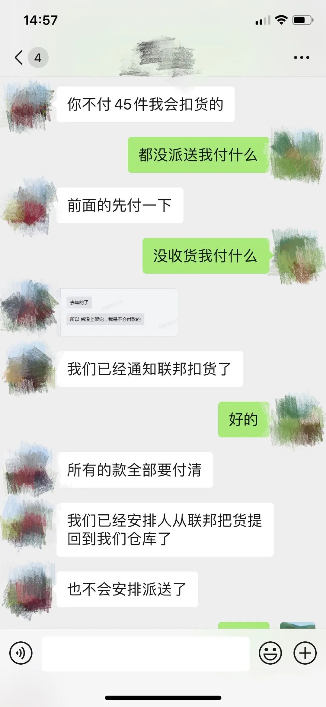 该货代向卖家索要货款的方式也让人大吃一惊,直接说不付钱的话就会扣货,随后又说已经通知联邦扣货了,要把货物从联邦那里提到他们的仓库,也不帮卖家派送了。
