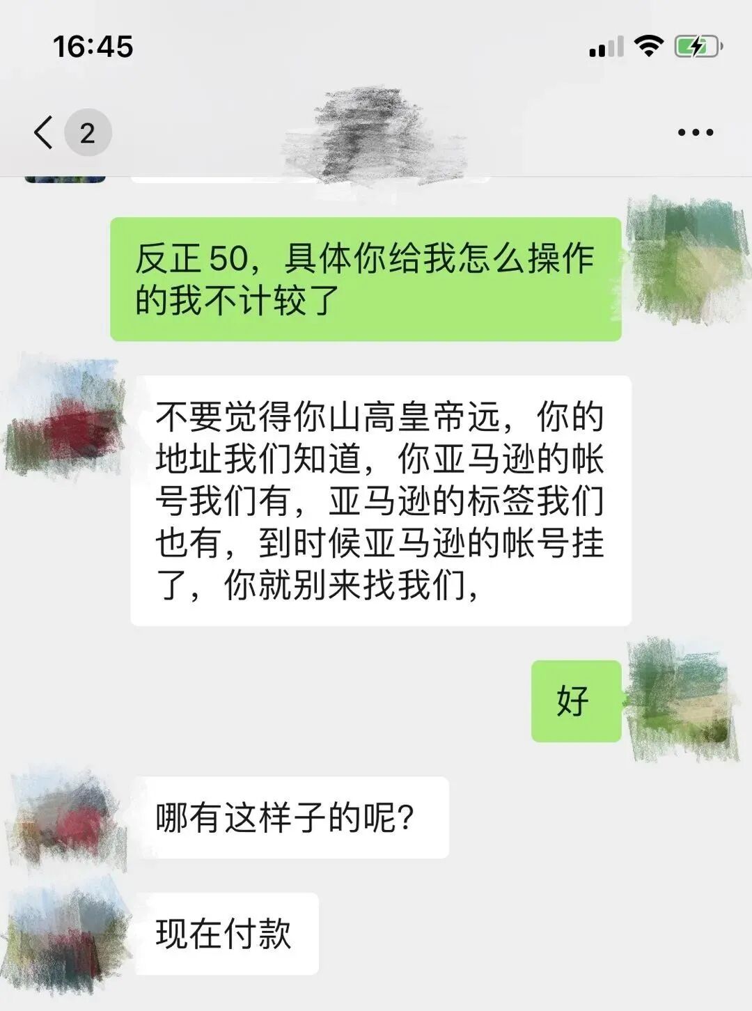 后面谈价格的时候,卖家拒绝按照快递价格付款,货代再次威胁说道:“不要觉得你山高皇帝远,你的地址我们知道,你亚马逊的帐号我们有,亚马逊的标签我们也有,到时候亚马逊的帐号挂了,你就别来找我们。”