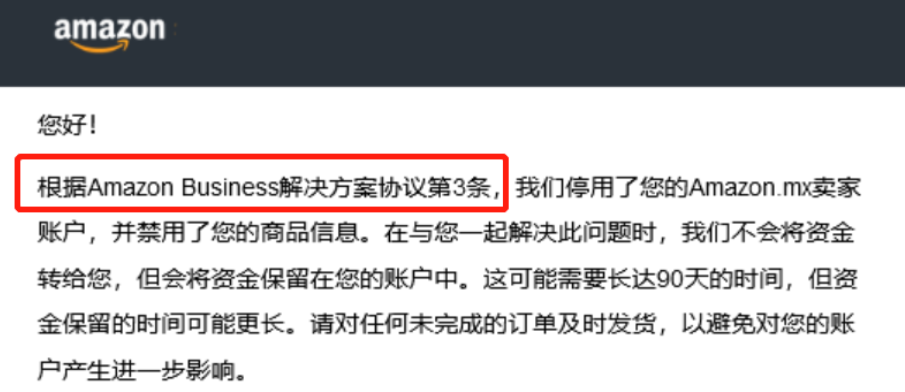 根据卖家收到的邮件,亚马逊表示封号原因仍然是违反了【亚马逊商业解决方案协议第3条】的规定。