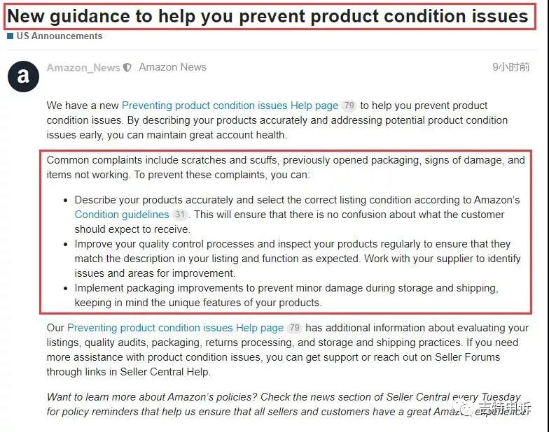 11月11日,亚马逊美国站发布一则有关新指南的公告,亚马逊希望通过这个新指南帮助卖家避免产品状况问题。
