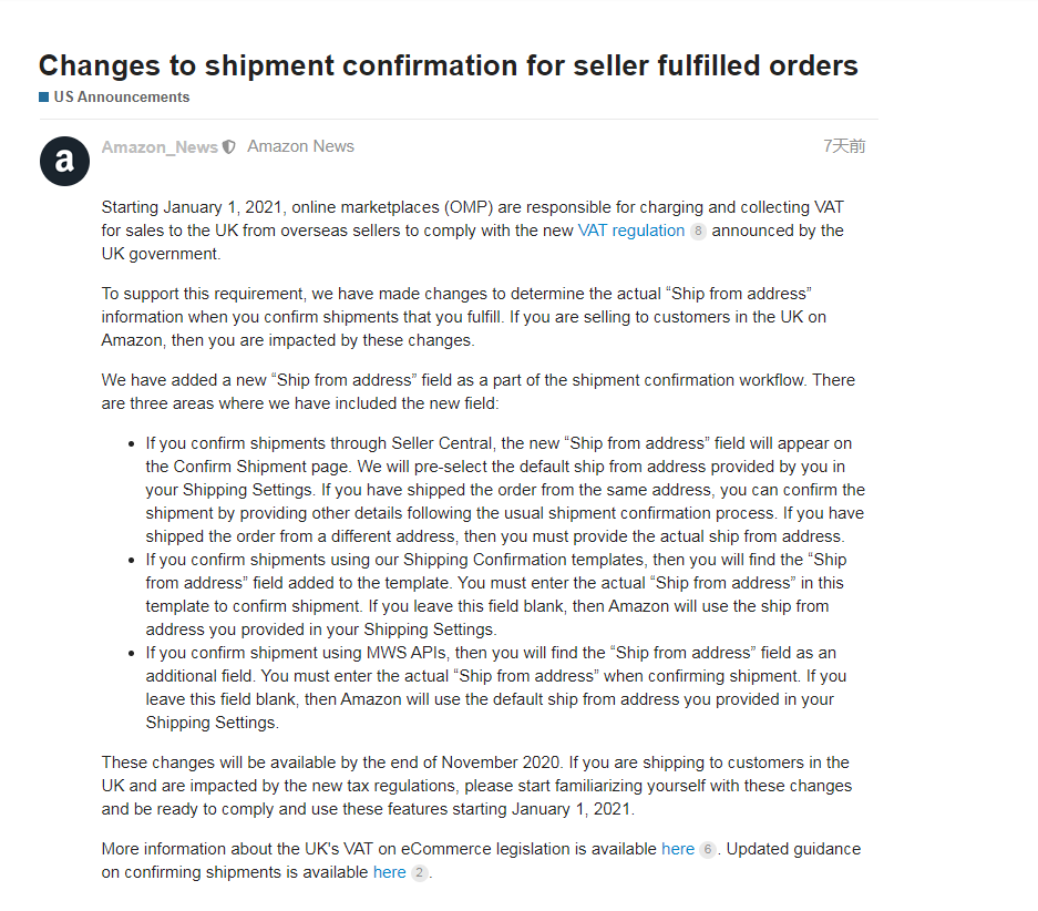 为支持此要求,亚马逊已做出更改,以确认卖家在确认发货时提供实际的“发货地址”信息。如果卖家在亚马逊上向英国人销售产品,那么卖家就会受到这些变化的影响。