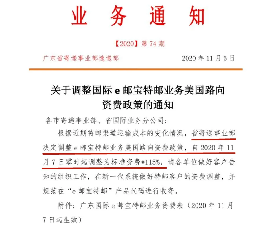 “根据近期特邮渠道运输成本的变化情况,省寄递事业部决定调整e邮宝特邮业务美国路向资费政策,自2020年11月7日零时起调整为标准资费*115%,请各单位做好客户告知的组织工作,在新一代系统做好特邮客户的资费调整,并规范在“e邮宝特邮”产品代码进行收寄。”