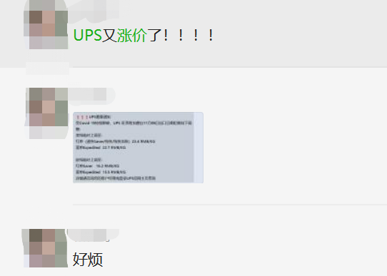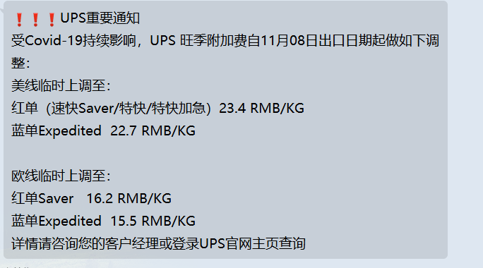 除了e邮宝,UPS也发布涨价通知称:受新冠疫情的持续影响,UPS旺季附加费自11月08日岀口日期起做如下调整: