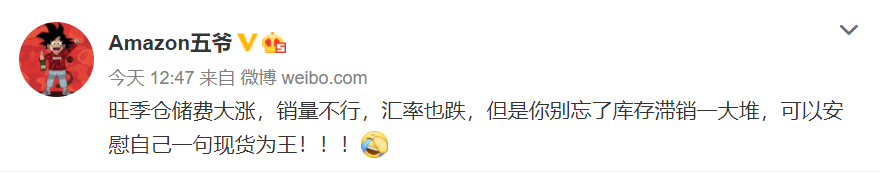 微博博主@Amazon五爷 对此也调侃到:旺季仓储费大涨,销量不行,汇率也跌,但是你别忘了库存滞销一大堆,可以安慰自己一句现货为王!!!