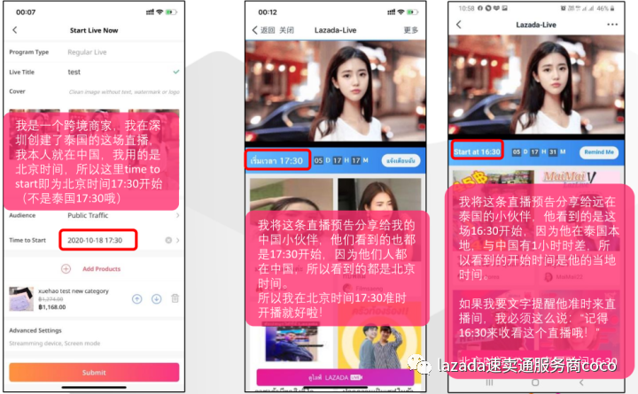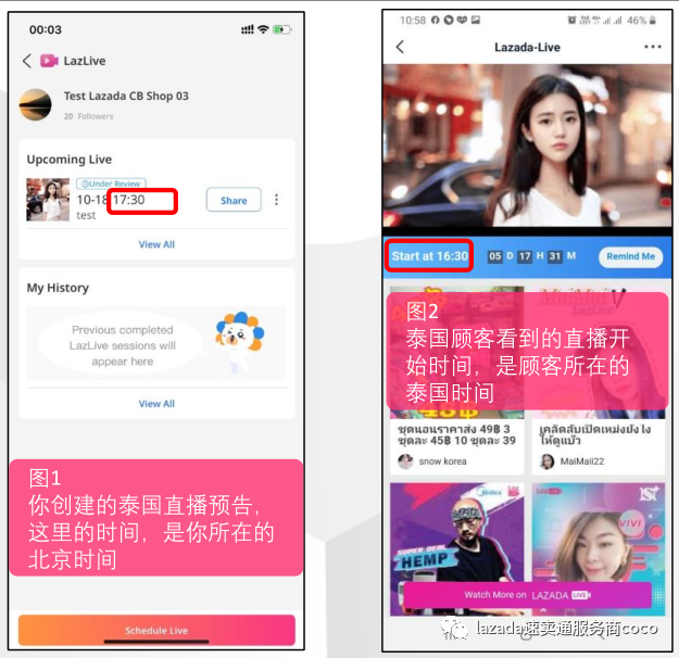 如图,举例:同一场直播,卖家设置直播time to start在北京时间17:30开始时(图1),此直播在泰国的开始时间就是当地时间16:30,泰国人民看到的也是16:30开始(图2)。