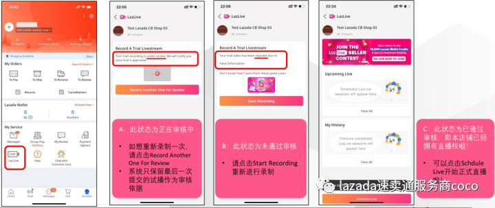 已提交1 分钟试播,如何判断审核结果?点击Laz–Live 图标, 根据ABC 三种页面