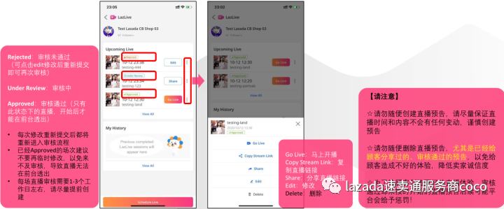 • 每一条预告创建成功后,都会自动进入Lazada后台审核系统,只有小二审核通过的直播预告,开播后才会被透出至前台页面