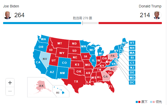 今天是11月6号了,等待了两天的美国大选结果依然没有出来。截止今天下午两点,美国大选票数依然与昨天的情况一样,拜登以264票暂时领先特朗普。