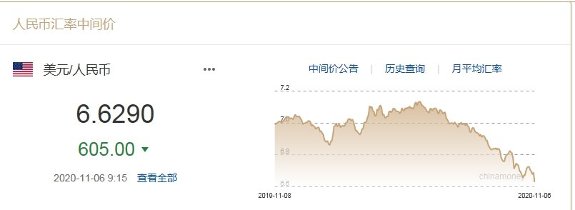 据中新网报道,2020年11月6日银行间外汇市场人民币汇率中间价为:1美元对人民币6.6290元,较上一交易日大幅调升605基点,创下2018年7月11日以来最高。